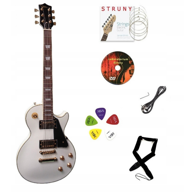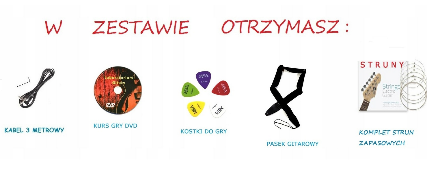 W zestawie z gitarą otrzymasz: PASEK GITAROWY, KOSTKI DO GRY, KURS DVD, KABEL 3 METROWY, KLUCZE DO REGULACJI ORAZ KOMPLET STRUN